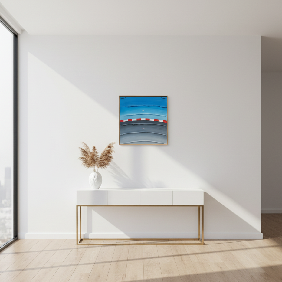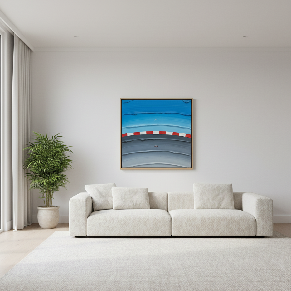 This piece translates the raw speed of the circuit into a minimalist, architectural statement. The blurred, horizontal strokes create a tangible sense of motion blur, while the iconic red and white of the apex serves as a single, sharp point of focus. It is precision, captured in art.
