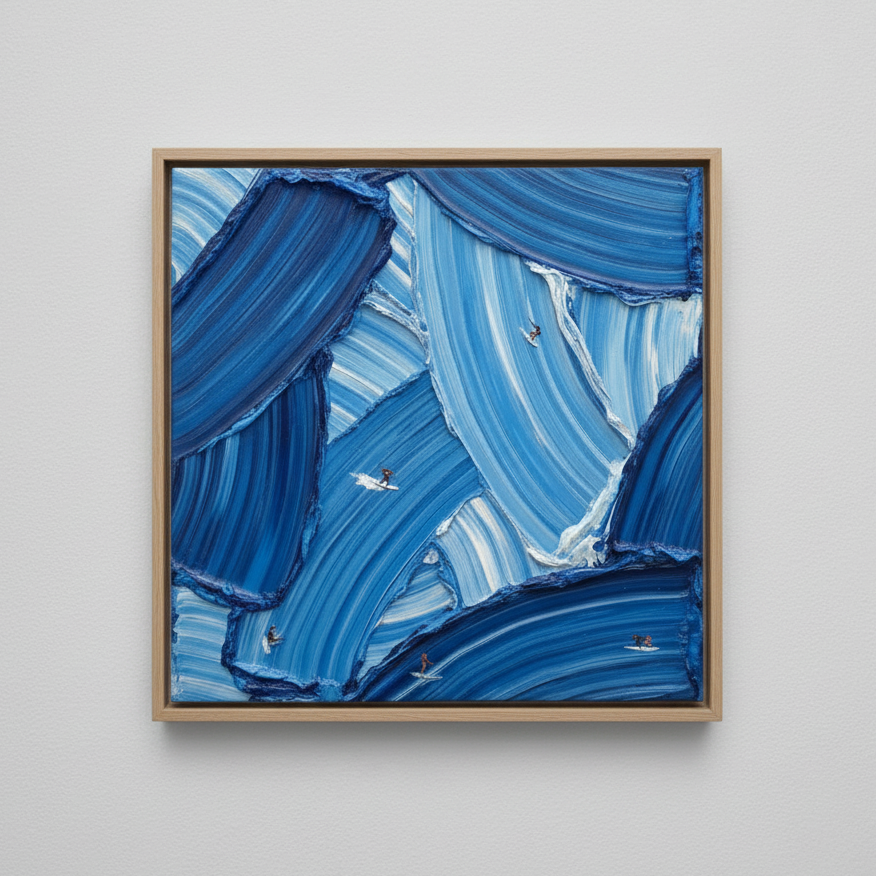 The artwork is defined by its deep, directional strokes, mimicking the powerful flow and momentum of the water. The surfers, dwarfed by the abstract, textured waves, illustrate a story of respect for the ocean and the thrill of the ride.